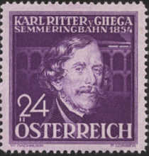 Autriche- Yt490 de1936 Karl Ritter von GHEGA , 1802 - 1860 ingénieur autrichien né à Venise- Italie où il exerça jusqu'en1836 après des études effectuées à Padoue. Ayant supervisé la construction de la ligne de chemin de fer entre Brno et Breclav dénommée "The Emperor Ferdinand North Railway" entre 1836 et 1840 , il effectua des voyages d'études en Europe et en Amérique du Nord puis entreprit de franchir le Semmering (Autriche) par la ligne Mürzzuschlag-Graz et Trieste, chose jusqu'alors considérée comme impossible. Annobli pour cette tache, il fût chargé d'édifier une ligne à travers la Transylvanie, mais mourut de la tuberculose avant d'en avoir vu l'achèvement. |